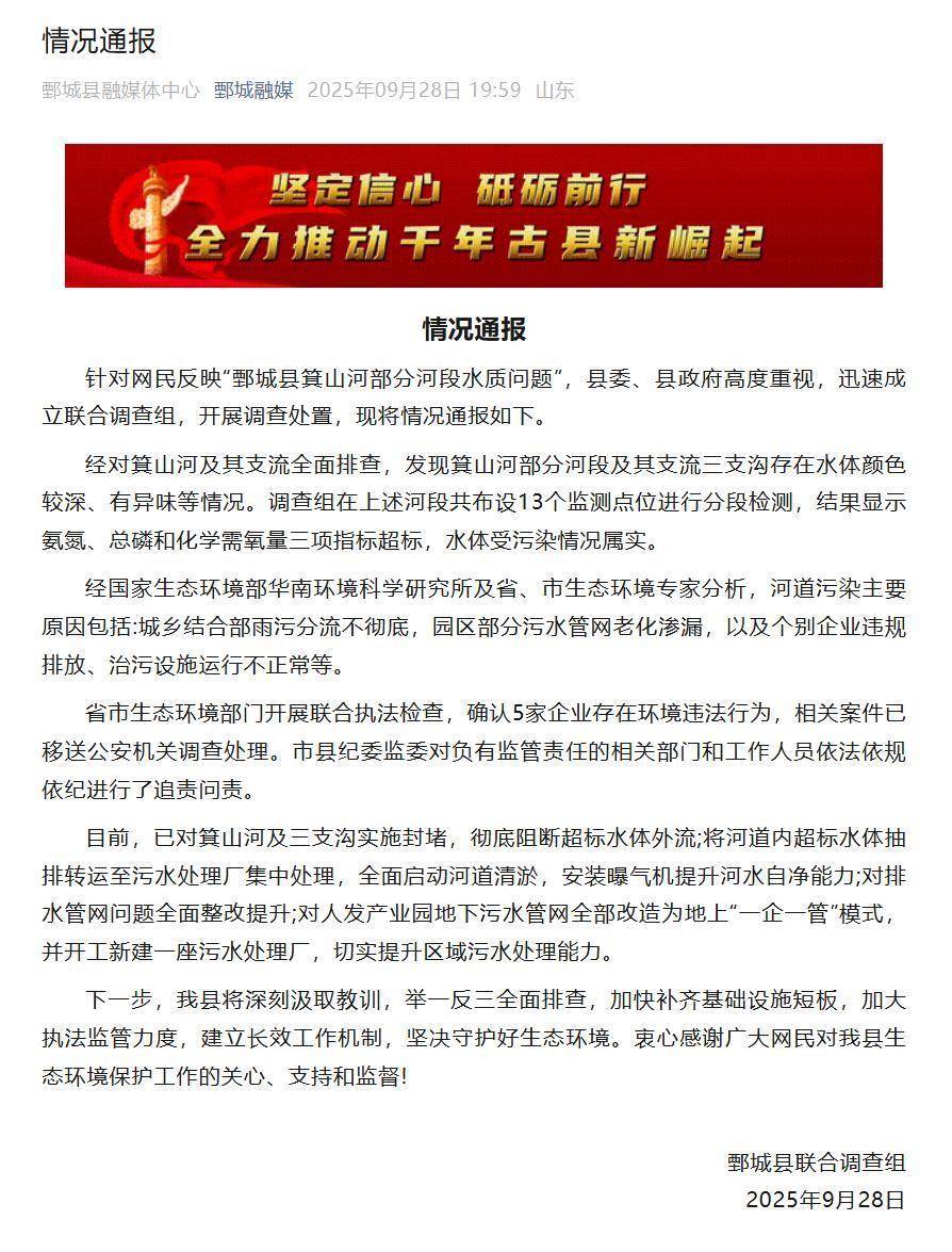 9月28日,山东省菏泽市鄄城县联合调查组发布情况通报: 针对网民反映“鄄城县箕山河部分河段水质问题”,县委、县政府高度重视,迅速成立联合调查组,开展调查处置,现将情况通报如下。 经对箕山河及其支流全面排查,发现箕山河部分河段及其支流三支沟存在水体颜色较深、有异味等情况。调查组在上述河段共布设13个监测点位进行分段检测,结果显示氨氮、总磷和化学需氧量三项指标超标,水体受污染情况属实。 经国家生态环境部华南环境科学研究所及省、市生态环境专家分析,河道污染主要原因包括:城乡结合部雨污分流不彻底,园区部分污水管网老化渗漏,以及个别企业违规排放、治污设施运行不正常等。 省市生态环境部门开展联合执法检查,确认5家企业存在环境违法行为,相关案件已移送公安机关调查处理。市县纪委监委对负有监管责任的相关部门和工作人员依法依规依纪进行了追责问责。 目前,已对箕山河及三支沟实施封堵,彻底阻断超标水体外流;将河道内超标水体抽排转运至污水处理厂集中处理,全面启动河道清淤,安装曝气机提升河水自净能力;对排水管网问题全面整改提升;对人发产业园地下污水管网全部改造为地上“一企一管”模式,并开工新建一座污水处理厂,切实提升区域污水处理能力。 下一步,我县将深刻汲取教训,举一反三全面排查,加快补齐基础设施短板,加大执法监管力度,建立长效工作机制,坚决守护好生态环境。衷心感谢广大网民对我县生态环境保护工作的关心、支持和监督! 鄄城县联合调查组 2025年9月28日  此前报道: 据政事儿消息,9月11日,有博主曝光鄄城县箕山河部分河段水质污染,“气味难闻,农民不敢用于浇灌”,“污染长度超20公里,已向相关部门举报”。 ![]() 网络视频画面 山东省菏泽市“鄄城融媒”9月13日凌晨消息,鄄城县联合调查组发布情况通报: 近日,针对网民反映鄄城县箕山河部分河段水质问题,我县高度重视,已成立由生态环境、水务、农业农村、住建等部门及有关方面专家组成的联合调查组,第一时间赶赴现场对视频反映有关问题逐一调查核实,对相关区域正在进行全面溯源排查,调查处理结果将及时向社会公布。 来源 | 鄄城融媒、政事儿 主编 | 彭丹 编辑 | 王志 象象留言有奖活动来啦!![]() (每周好礼:大象文创袋、象象定制笔记本,二选一) 获奖名额: 最有态度奖:当周留言总数前5名 金句达人奖:当周精选留言条数前5名 结果公布:每周一获奖名单将在公众号菜单栏“热门”——“”中公布,中奖者需在48小时内私信联系客服领取,逾期视为放弃。